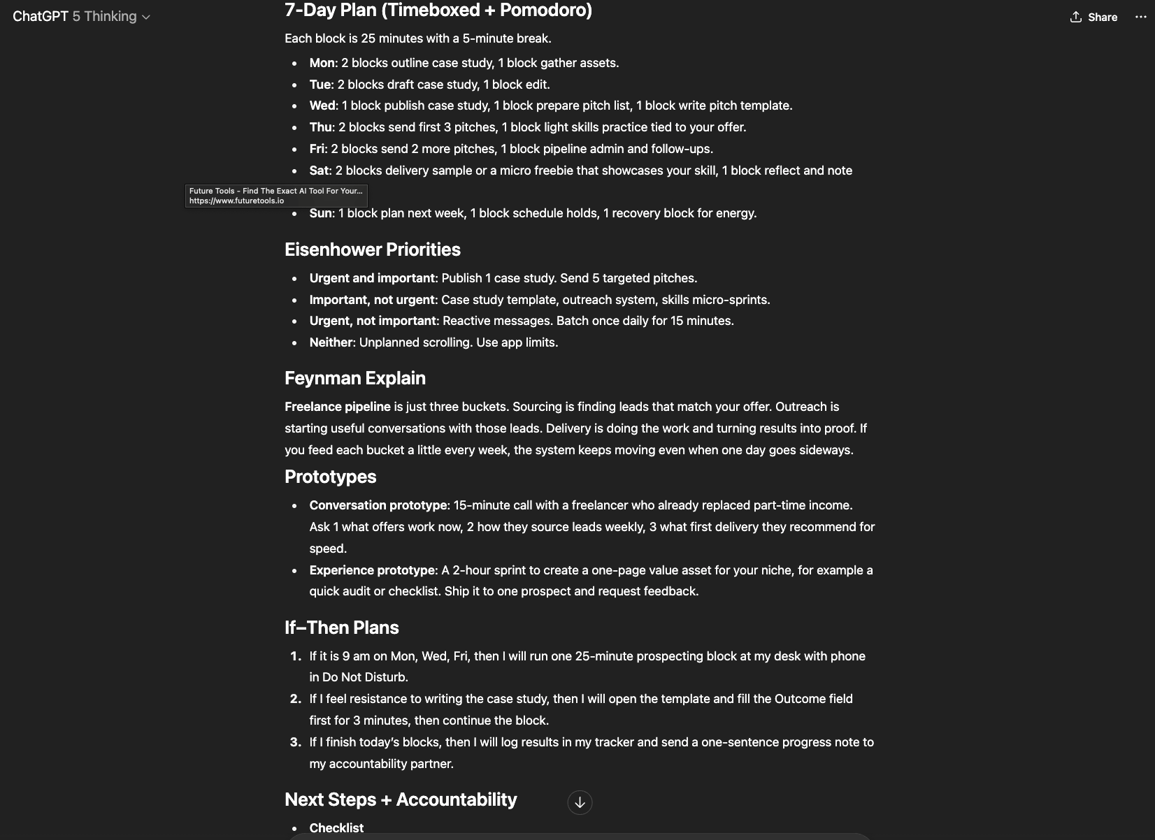 The Bottom Line: One prompt session = 7 days of focused execution. No more "I'll figure it out tomorrow." No more analysis paralysis. Just clear blocks, concrete actions, and momentum that compounds.