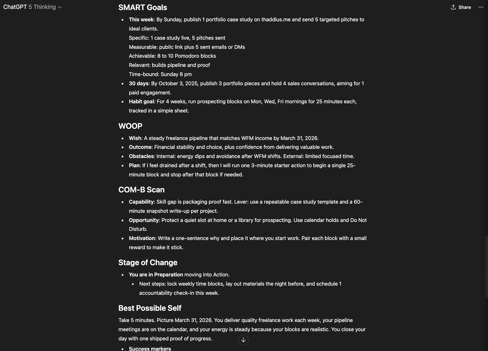 The Framework Kicks In Watch how the prompt immediately structures chaos into clarity. Three targeted questions surface the real challenges, then SMART goals turn "wanting freelance success" into measurable weekly targets.