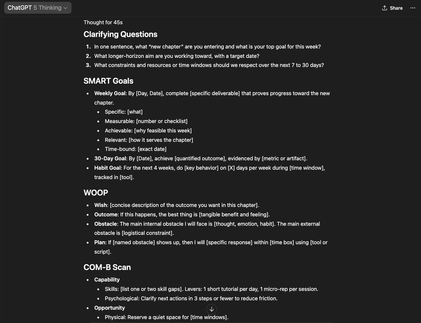 [Output headings: Clarifying Questions; SMART Goals; WOOP; COM‑B Scan; Stage of Change; Best Possible Self; 7‑Day Plan (Timeboxed + Pomodoro); Eisenhower Priorities; Feynman Explain; Prototypes;