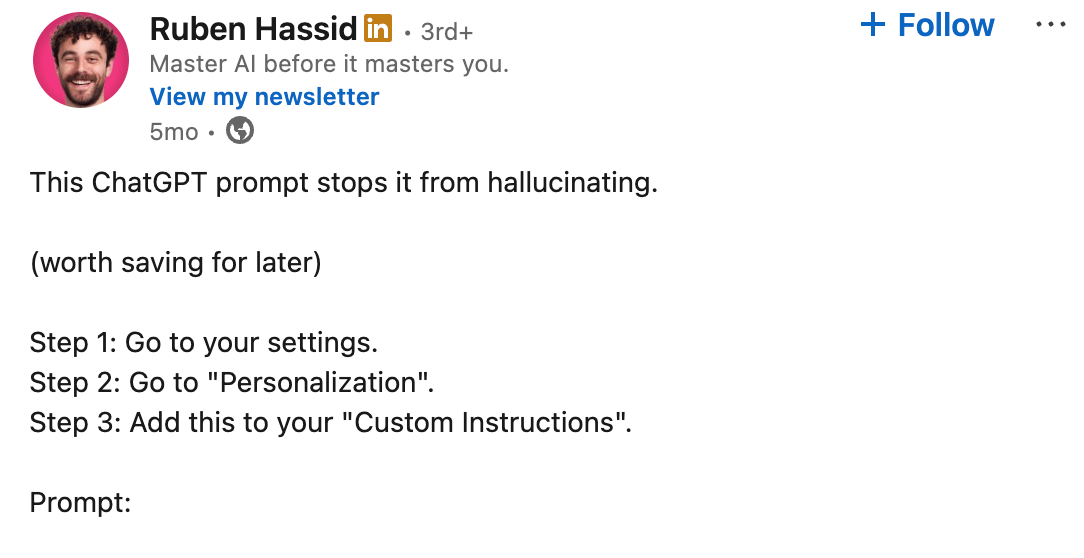 Setup: ChatGPT fabricates approximately 20% of academic citations and introduces errors in 45% of real references. This prompt goes in your ChatGPT custom instructions to force the AI to acknowledge uncertainty rather than invent answers.