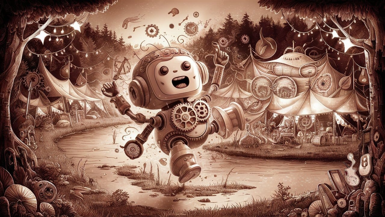 A whimsical and enchanting illustration of a playful AI robot with gears and cogs, adorned with soft watercolor effects, celebrating at a lively music festival by a river and forest. The festival is filled with intricate details such as musical instruments, tents, and twinkling festival lights. The overall atmosphere is reminiscent of Roald Dahl's illustrations, with a sepia tone and detailed line work. The image is presented in high definitio, and a vibrant color scheme that captures the essence of the magical festival.