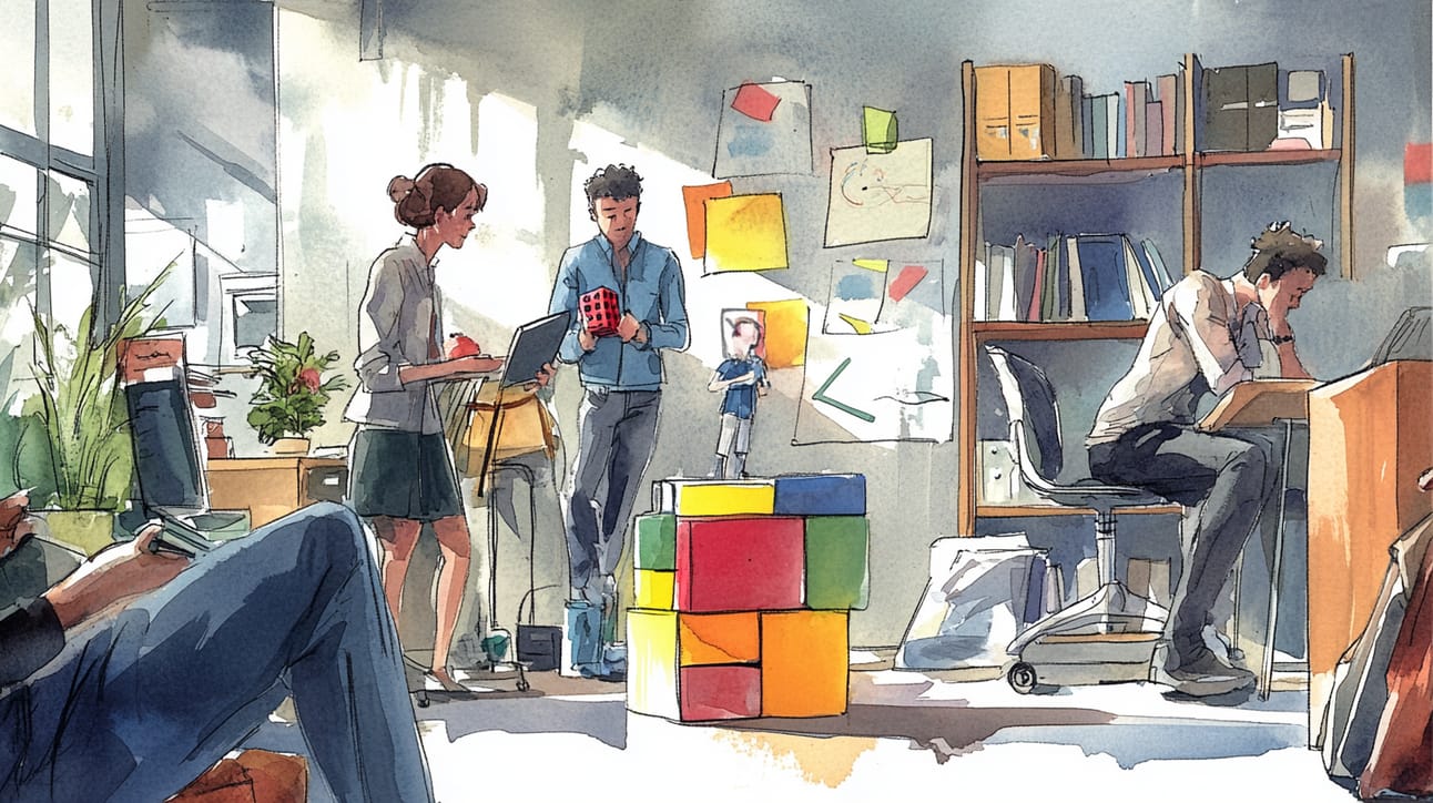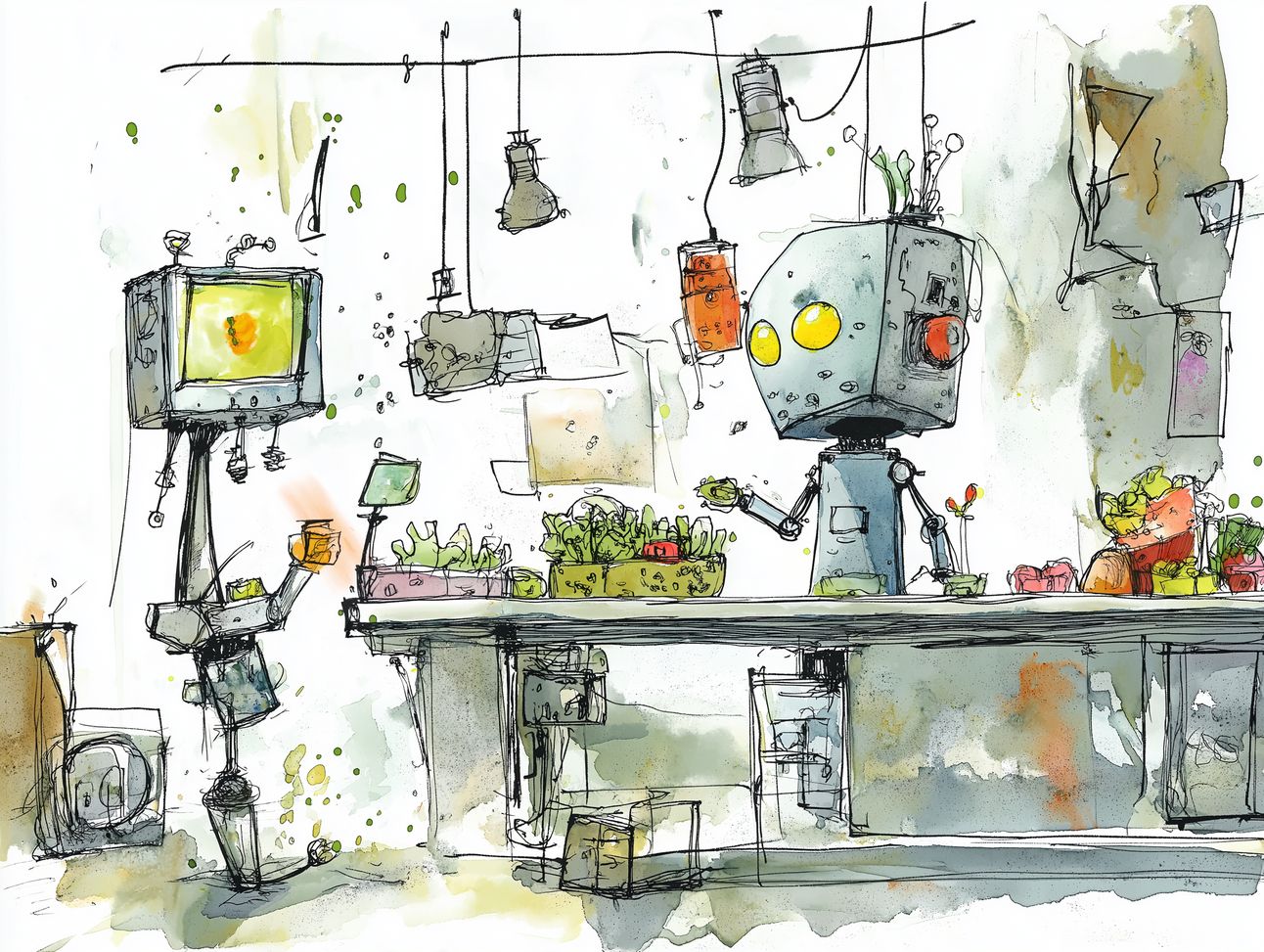[Modern] US newspaper illustration style infused with Quentin Blake-inspired whimsy, depicting a dynamic gaming scene where an oversized AI-powered NPC faces off with a cautious game developer. [Energetic] atmosphere conveyed through [vivid ink pen and watercolor]. [Exaggerated features] add playful energy. [Jubilant chaos] captures the scene's essence. Composition reminiscent of [surrealism], with [expressive character movement]. [Vibrant neon colors] enhance the [tech-themed motif]. [Cross-hatched details] provide depth and interest. Illustrated using [brush pens and watercolors].