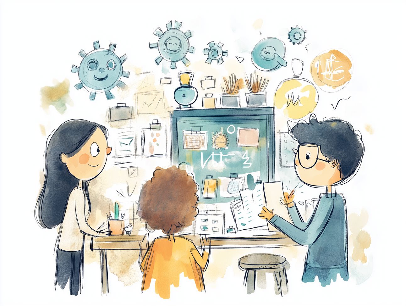 [Modern] US newspaper illustration style infused with Quentin Blake-inspired whimsy, depicting a bustling college classroom filled with students collaborating with AI holographic figures, juggling textbooks and digital devices. [Innovative] atmosphere conveyed through [dynamic line work]. [Expressive characters] add playful energy. [Curiosity and excitement] capture the scene's essence. Composition reminiscent of [John Tenniel's work], with [quirky technological motifs]. [Vivid blues and greens] enhance the [futuristic ambiance]. [Lively textures and patterns] provide depth and interest. Illustrated using [ink pens and watercolors].
