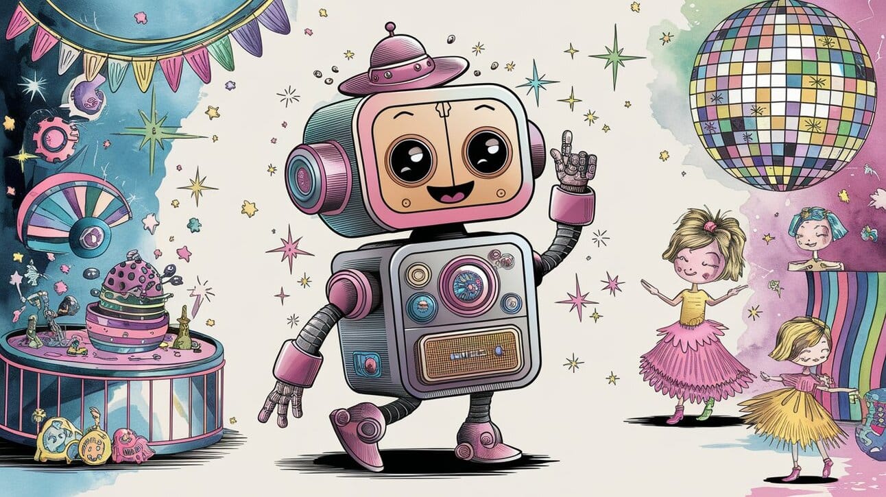 In a whimsical setting, the robot is seen in disco clothes and shows, surrounded by intricate details such as a fun disco, a disco ball , and elements inspired by Roald Dahl's illustrations.