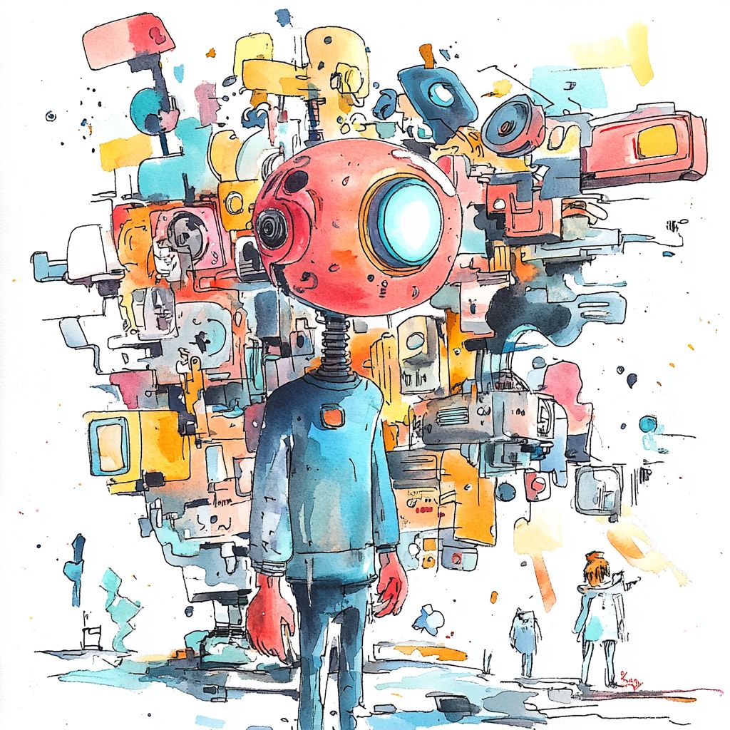 A american illustration in the style of quentin blake illustrations of a charming AI robot adorned with gears and cogs, exuding a playful and quirky personality.
